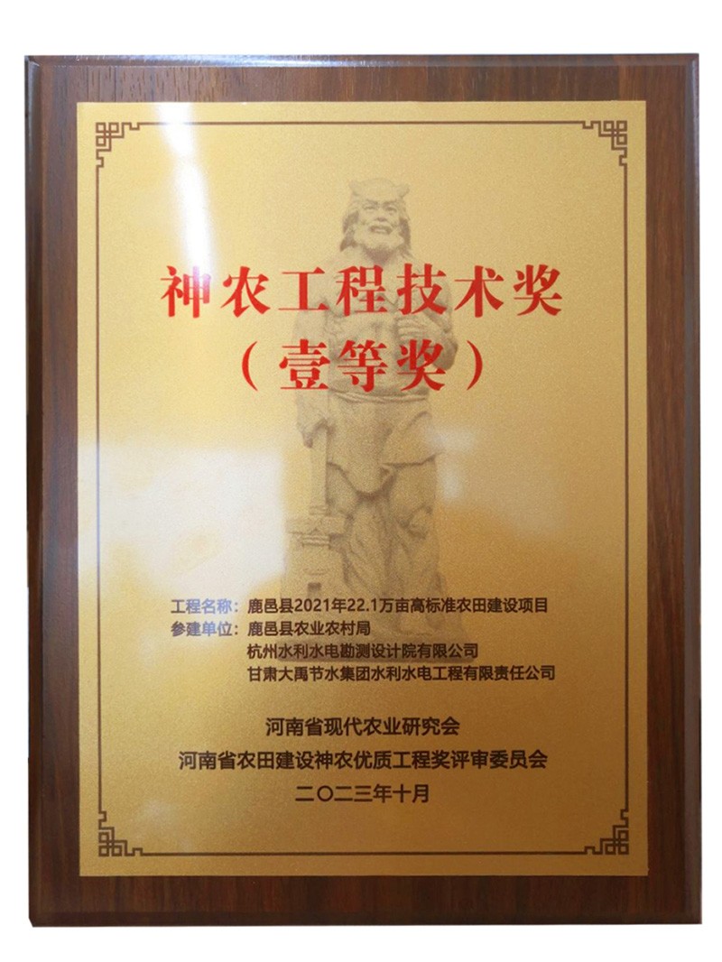 12月26日,大禹节水承建的鹿邑县2021年22.1万亩高标准农田建设项目荣获2023年度神农工程技术奖一等奖。