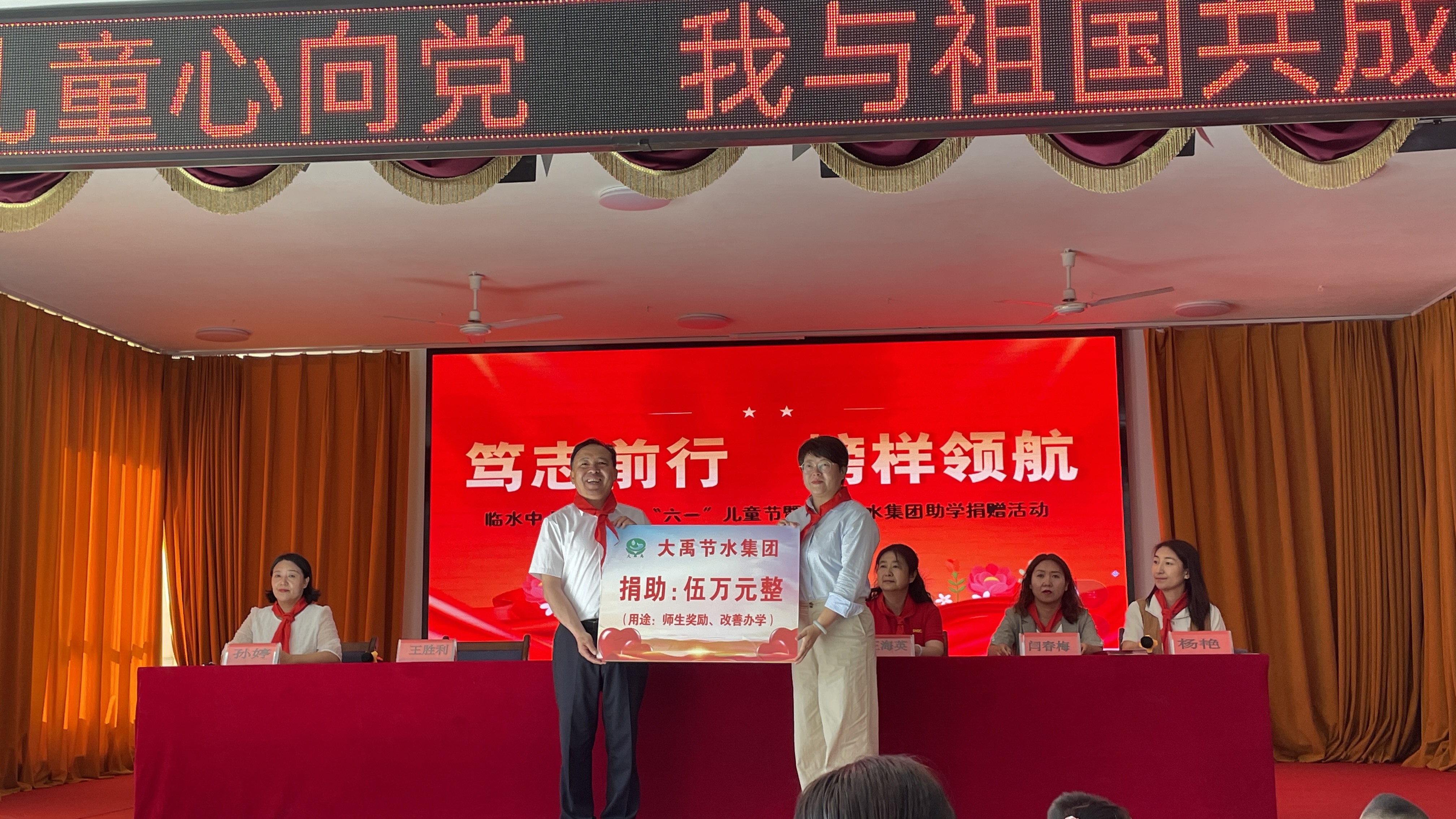“大禹节水奖学金”捐赠仪式分别在甘肃省酒泉市酒泉中学、肃州区临水中心小学举行,大禹节水集团为酒泉中学捐赠10万元、临水中心小学捐赠5万元。