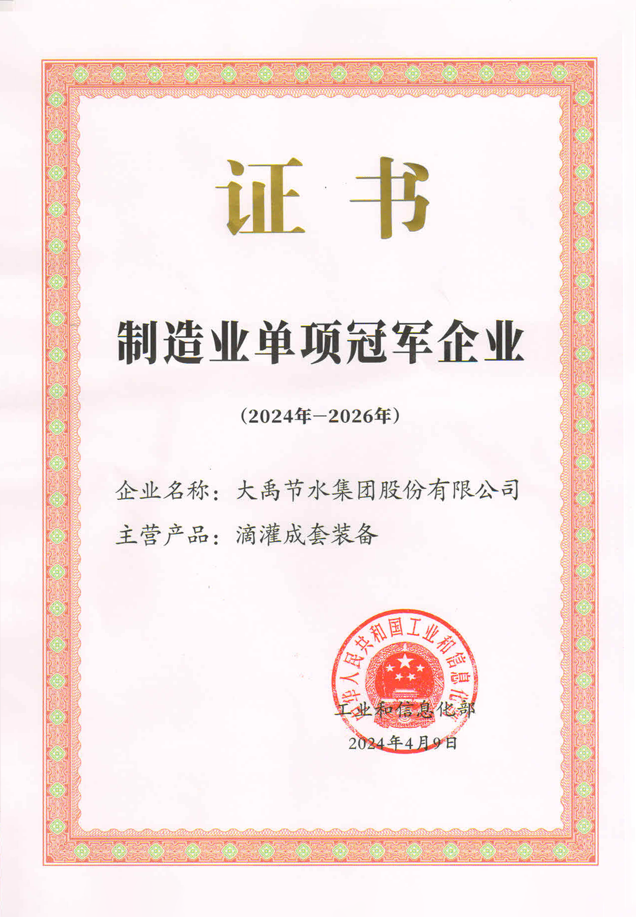 大禹节水集团凭借卓越的业绩和科技创新能力,荣获全国第八批制造业单项冠军企业。