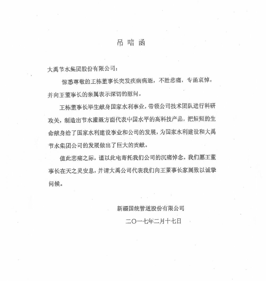 新疆国统管道股份有限公司吊唁函