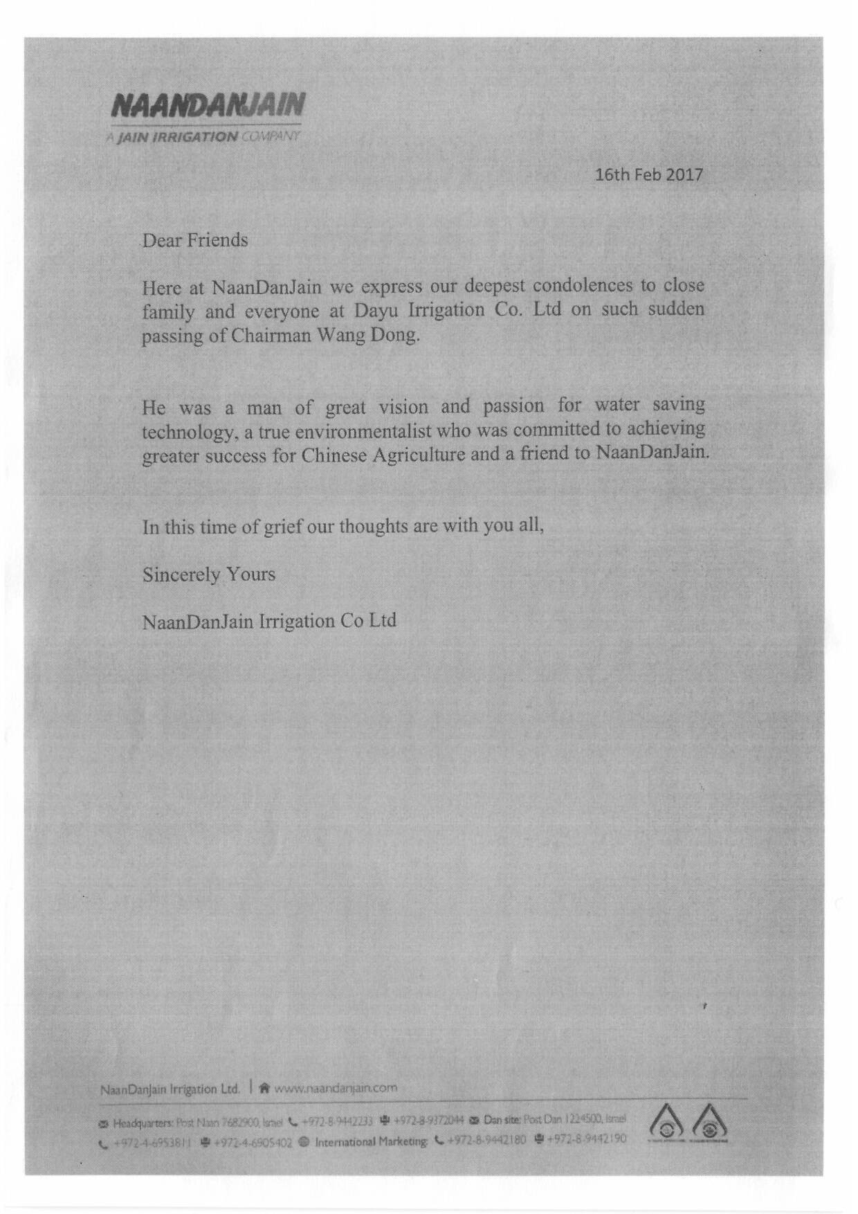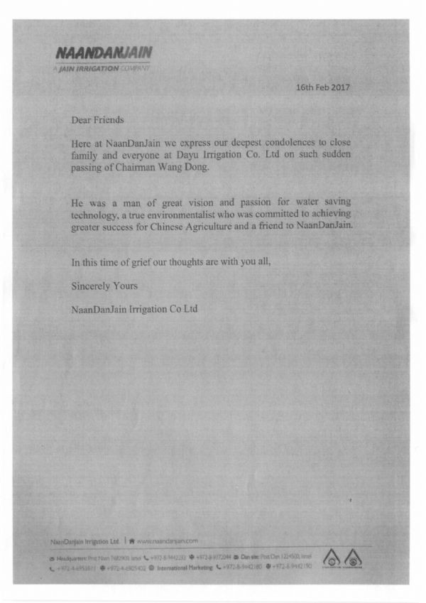 以色列纳安丹灌溉有限公司唁电