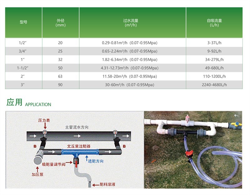 利用虹吸原理,方便吸入各种液态肥料并注入灌溉管道中,水肥均匀灌溉各种作物;
