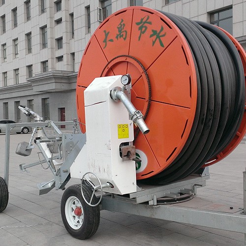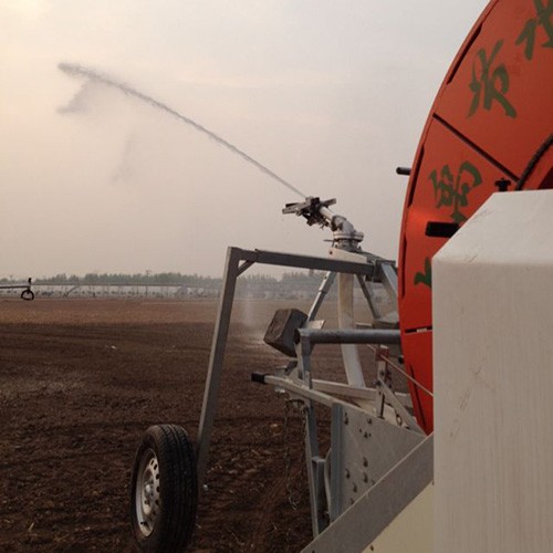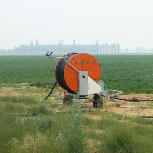 卷盘式喷灌机是一种将牵引PE管缠绕在绞盘上,利用喷灌压力水驱动水涡轮旋转,经变速装置驱动绞盘旋转,拉动喷头车移动和喷洒的灌溉设备。
