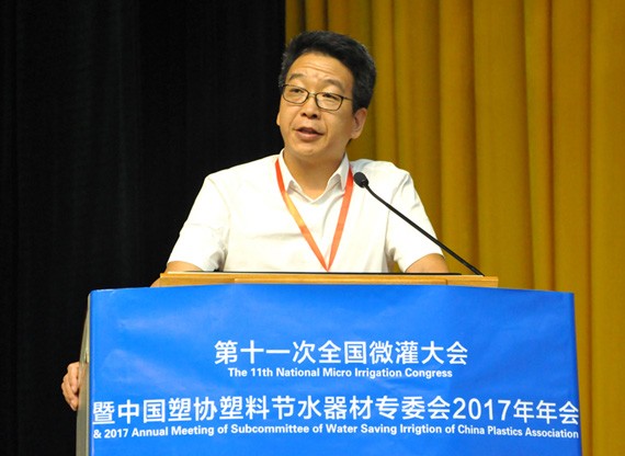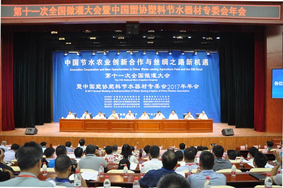 2017年8月5日,第十一次全国微灌大会暨中国塑协塑料节水器材专委会2017年年会在新疆生产建设兵团第八师石河子市隆重开幕,来自国内外微灌行业及相关领域的院士、专家、学者及企事业单位代表500余人相聚一堂,针对微灌领域科技问题、技术产品及发展方向进行深入地探讨和交流。新疆兵团第八师石河子市党委书记、八师政委邹跃斌,中国工程院院士、中国农业大学中国农业水问题研究中心主任康绍忠,中国塑料加工工业协会常务副理事长、秘书长朱文玮,新疆兵团水利局党组成员、副局长张生龙,新疆维吾尔自治区党委农办副主任聂新,新疆兵团第八师石河子市党委常委、副师长侯国俊,新疆天业集团党委书记、董事长宋晓玲,中国灌区协会秘书长季仁保,中国水科院水利研究所副所长、中国灌区协会微灌分会会长龚时宏等领导及专家出席大会。