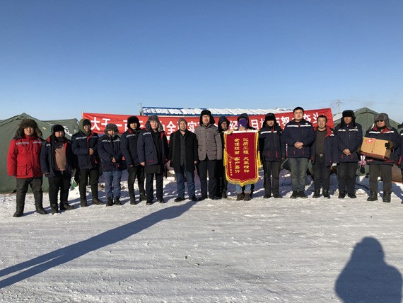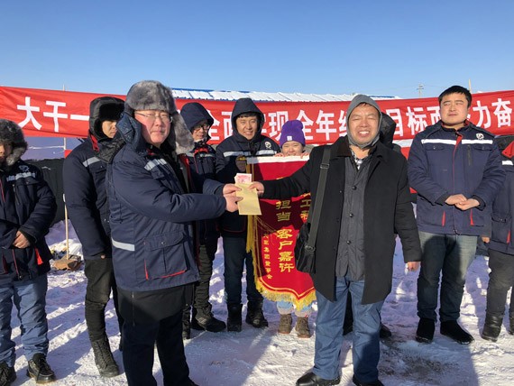 王光敏代表集团董事会现场宣读了董事长致牙克石项目一线员工的亲笔慰问信,代表大禹节水董事会授予呼伦贝尔牙克石项目部“优质工程,大禹精神;责任担当,客户嘉许”锦旗一面,并送去了5000元慰问金及慰问品。