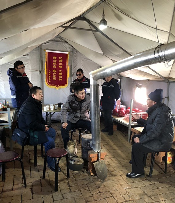 每天早晨,伴随着阵阵寒气,项目施工人员用从远处打来的带着冰碴的水,草草的洗漱过后就开始了新的一天的工作。从驻地到施工现场,多为过膝深的积雪,就是这样的路途,项目施工人员每天要走好几里。他们认真检查每个设备的零部件,严格每一道施工程序,进行设备安装、管道检查。他们心里只有一个念头:白天一定要把工作做细、做扎实,保质保量、保进度。白天按照施工进度,完成施工任务,才能享受一个“美好”的夜晚,因为不用在夜里加班,想象一下这样的天气在夜里加班是个怎么样的滋味,而这样的滋味他们也是常常要品尝的。