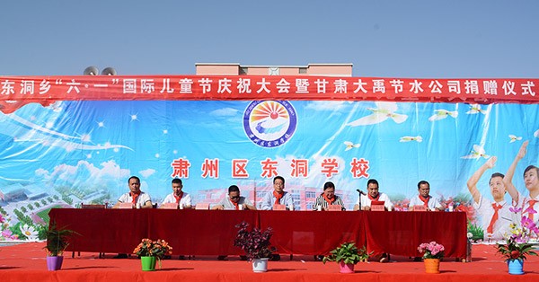 六月是花朵争艳绽放的季节,也是孩子们喜欢的"儿童节"到来的季节。6月1日上午,在第68个国际儿童节来临之际,大禹节水集团公司党委书记、副董事长王冲,总裁助理、团委书记巨飞雷一行,带着大禹人的温暖来到甘肃省酒泉市肃州区东洞学校,为该校捐赠了价值2万元的办公必备用品,与全校师生共度六一儿童节。东洞乡党委书记吴海霞,党委副书记郎海斌,东洞学区主任、东洞学校校长运启业,副校长赵建伟、秦刚国出席捐赠仪式。东洞学校校长运启业、大禹节水集团公司党委书记王冲、东洞乡党委书记吴海霞等领导先后在捐赠仪式上致辞。