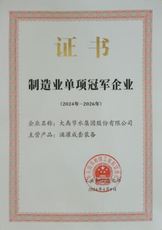 大禹节水集团凭借卓越的业绩和科研创新能力,荣获全国第八批制造业单项冠军企业称号。本次入选的单项冠军产品是滴灌成套装备技术产品,此产品打破了国外技术垄断,实现了国产化替代;祛根防负压抗堵型滴灌技术,能够有效缓解农业节水灌溉灌水均匀性差、易堵塞和运行成本高的难题,带动了行业整体水平的提升。