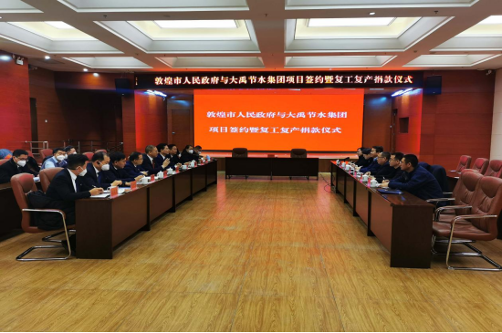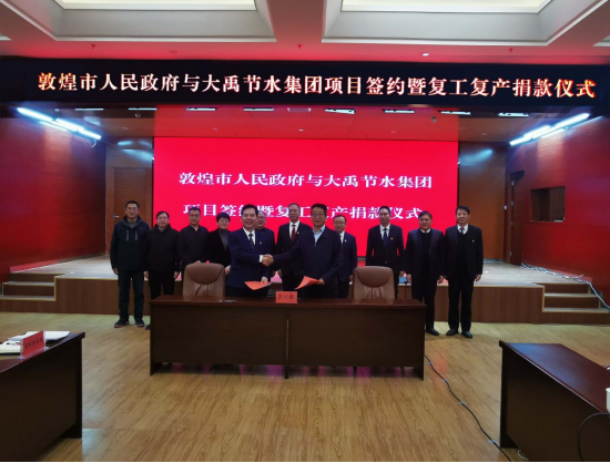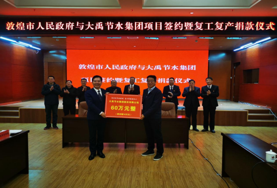 1月4日上午,敦煌市人民政府与大禹节水集团举行投资建设PCCP管道生产项目签署合作框架协议暨复工复产捐款仪式,活动在敦煌市飞天剧院会议厅举行。王冲书记代表大禹节水集团就助力复工复产向敦煌市政府捐款人民币60万元整(其中肃州镇养老院10万元整)。