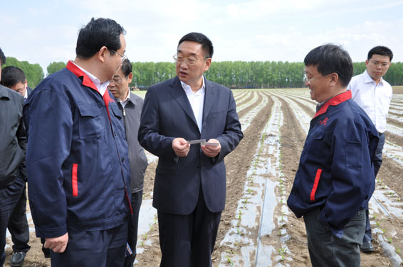 集团公司副总裁门旗博士向陈雷部长详细介绍大禹膜下滴灌系统