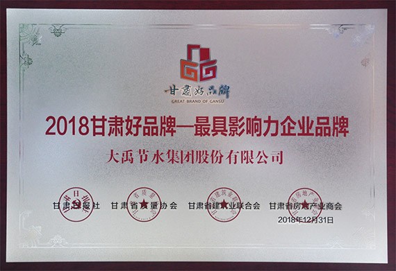 1月11日上午,由甘肃省发改委、省市场监管局指导,甘肃日报社、甘肃省质量协会、甘肃省建筑业联合会、甘肃省房地产业商会联合主办的2019甘肃品牌论坛在兰州宁卧庄宾馆举行。本届论坛主旨为"聚合品牌力量 ,推动创新发展",大禹节水集团股份有限公司等20家企业荣获"最具影响力企业品牌",大禹节水集团党委书记王冲代表获奖企业做交流发言。