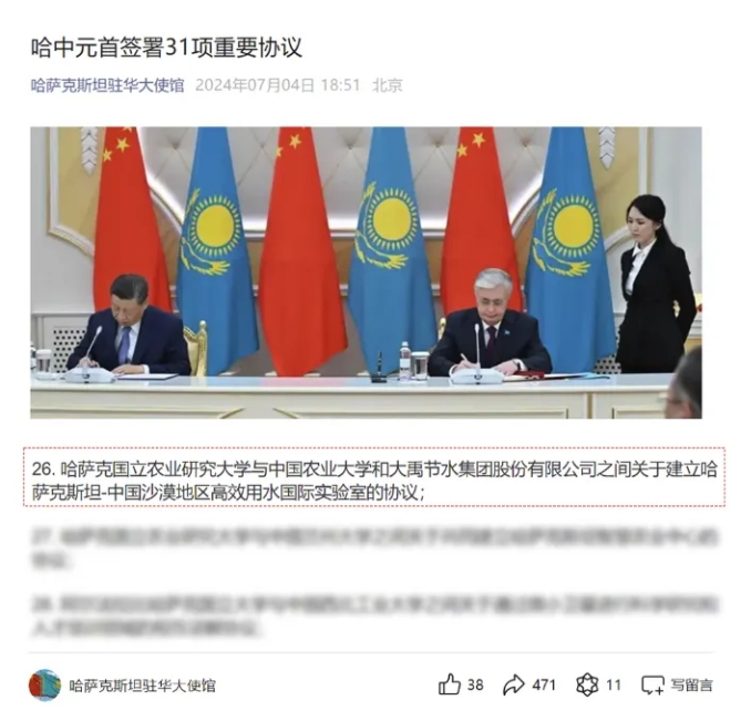 此外,两国元首的见证下,双方代表团签署了31项重要协议。其中,第26项为哈萨克国立农业研究大学与中国农业大学和大禹节水集团股份有限公司之间关于建立哈萨克斯坦-中国沙漠地区高效用水国际实验室的协议。