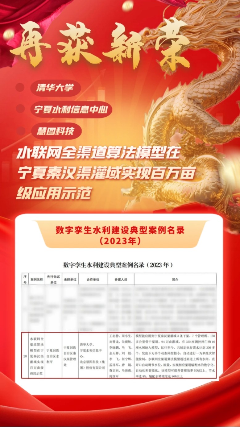 瑞雪兆丰年,龙年好运至。日前,水利部发布“数字孪生水利建设典型案例名录(2023年)公示”,清华大学、宁夏水利信息中心与大禹慧图科技集团联合参建的课题项目“水联网全渠道算法模型在宁夏秦汉渠灌域实现百万亩级应用示范”入选水利部数字孪生水利建设典型案例名录,被评为典型案例。