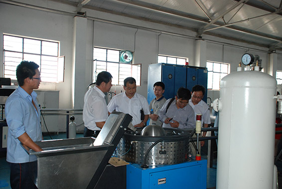 大禹节水集团总裁谢永生向王丁宏教授一行介绍滴灌管产品生产工艺