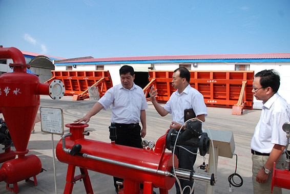 大禹节水集团总裁谢永生向王丁宏教授一行介绍公司研发生产的各类施肥过滤器产品