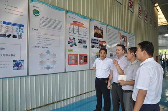 在公司文化展示墙前,Avner Hermoni 先生认真了解了大禹节水发展历程等相关情况,精通中文的伯尔梅特(BERMAD)公司销售总监Dan Leshem 先生对大禹公司的制度体系建设产生了浓厚的兴趣,详细了解了大禹节水公司近些年来取得的进展与荣誉,高度评价了大禹体系建设与管理理念,并对大禹节水海外业务的开展提出了深层次的建议。