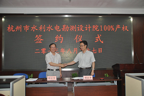 杭州市林业水利局局长周定炎与杭州市水利水电勘测设计院院长尉高洋分别代表转让方和受让方签字