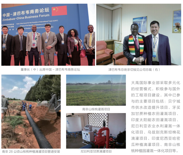 大禹节水积极响应国家“一带一路”倡议,不断探索“走出去”和“引进来”的新思路、新模式,先后成立了大禹节水美国技术中心、大禹节水以色列公司以及以色列创新研发中心,整合全球资源、实现国际业务快速发展。大禹节水的产品与服务遍及韩国、泰国、南非、澳大利亚等50多个国家和地区。除了一般贸易之外,大型农田水利、农业灌溉、城市供水等成套项目和一体化项目也取得了重大进展,逐步形成海外业务全球战略布局。