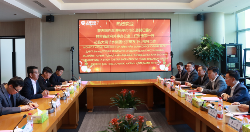 10月18日上午,蒙古国巴彦洪格尔市市长恩赫巴雅尔(Enkhbayar)、巴彦洪格尔市呼拉尔公民代表主席巴图才仁(Battseren)、巴彦洪格尔输电配电公司执行董事乌兰巴雅尔(Ulambayar);甘肃省政府外事办党组书记、办公室主任张宝军,省政府外事办党组成员、对外友协专职副会长梁保平,省对外友协友城工作处处长康广宏一行领导莅临大禹节水集团北京研发中心考察座谈,大禹节水集团党委书记王冲等陪同。