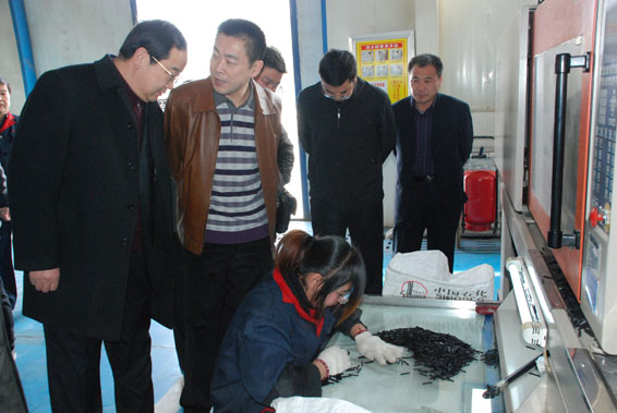 在滴灌车间的滴头生产机器旁詹市长向公司董事长王栋了解滴头的生产加工情况