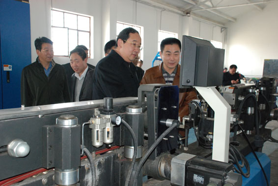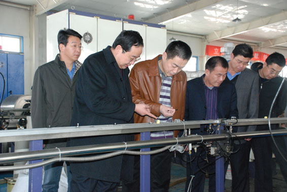 在公司新滴灌车间詹市长饶有兴致的了解滴灌带生产线数控设备的运行原理