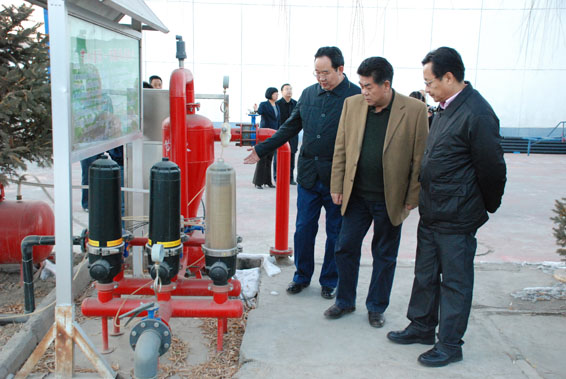 项目验收专家组一行在集团公司董事长王栋的陪同下在公司试验田前了解公司自主研发的依靠太阳能发电储电的全自动施肥过滤器系统
