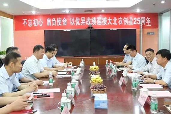 大禹节水集团公司总裁谢永生对大北农集团总部和农信总部进行了参观,观看了大北农集团企业宣传片,听取了副总经理徐万涛对大北农集团的详细介绍。并现场与徐万涛副总经理进行了深入交流。
