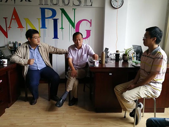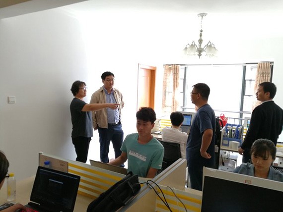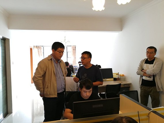 大禹智慧水务公司软件工程师岳元向董事长王浩宇介绍系统开发情况