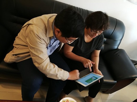 大禹智慧水务公司总经理刘美红向董事长王浩宇介绍新开发的智慧水务管理系统