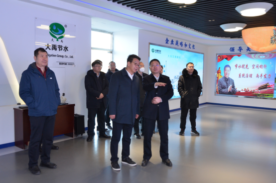 在大禹文化展厅,大禹节水党委书记王冲详细介绍了大禹节水的发展历程、使命愿景、荣誉奖项和公司的全产业链布局。集团总裁谢永生详细介绍了元谋节水灌溉项目、彭阳人饮项目等代表性案例及商业模式。农环投集团总裁张昊详细介绍了武清农村污水项目取得的成就,通过运用PPP模式,缓解了政府一次性财政投入的压力,建成了几百个村庄的生活污水处理基础设施,最终解决了全区农村生活污水污染周边环境及地下水源的难题,极大地改善了农村人居环境,黄克起对此给予了高度的评价。