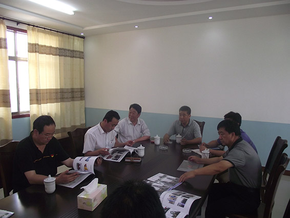 董事长王栋一行与江苏江杨建材机械公司有关负责人进行座谈,正在通过江杨建材机械公司宣传册深入了解这家公司