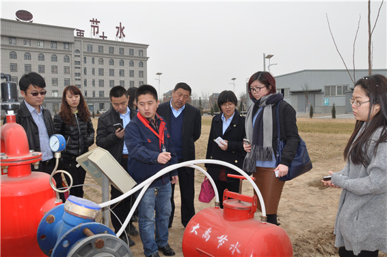 大禹节水(天津)有限公司研发中心战国隆主任向中联重机股份有限公司海外事业部管理层及埃塞俄比亚首席代表庄克浩等人介绍公司自主研发生产的自动化施肥过滤器设备