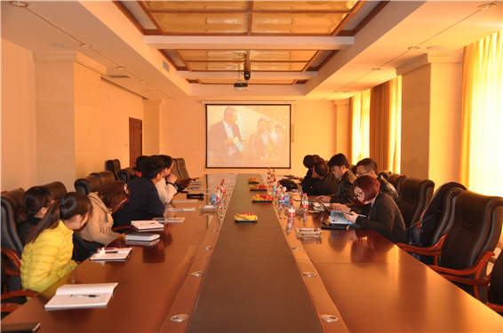 中联重机股份有限公司海外事业部管理层领导及埃塞俄比亚首席代表庄克浩等人在会议室观看宣传片