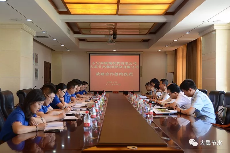 签约仪式前,双方在会议室举行座谈。大禹节水集团公司董事长王浩宇详细介绍了公司在20年的发展过程中围绕“三农三水"领域建设的重大项目的经验和模式。王浩宇表示,通过此次战略框架协议的签署,大禹节水集团将围绕框架内容,积极组织公司更多的科研力量和团队,整合外部资源针对永定河流域涉及的四个省区相关的农业问题,公司将努力探索,加强研究与实践,建设一批为华北乃至全国有示范推广价值的新机制和新模式。王浩宇最后表示,大禹节水集团将继续发挥艰苦作战的作风,承担社会责任,发挥民营企业在机制方面的优势,加强双方的战略合作,共同推动永定河流域农业农村加速发展。