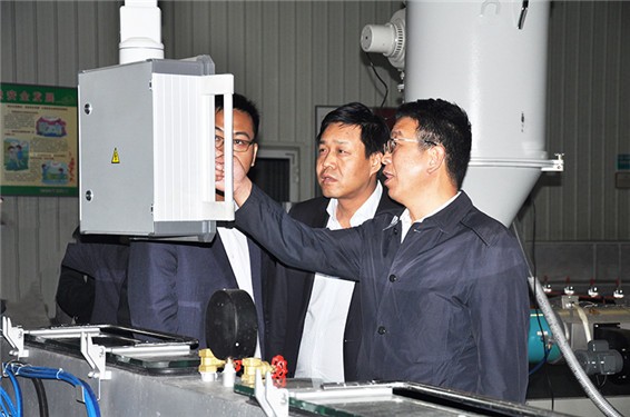 大禹节水集团公司党委书记、副董事长王冲等公司领导陪同李大辉总经理一行在滴灌(管)带生产车间参观考察