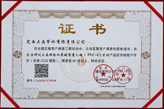 近日,全国实施用户满意工程推进大会在浙江省宁波市召开,大禹节水定西公司生产的PVC-U管材产品荣获2017年度"全国实施用户满意工程(产品类)"奖,成为甘肃省获此殊荣的两家企业之一。