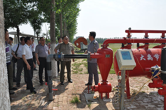 大禹节水(天津)有限公司董事长王冲向柴绍豪一行介绍公司研发生产的全自动施肥过滤器产品应用情况