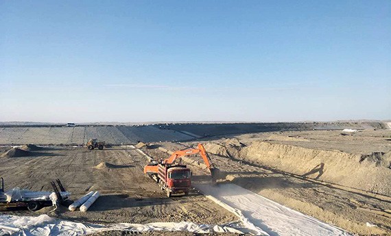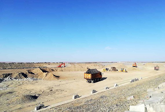 在大禹节水集团承建的阿克塞抗旱应急调蓄水库工程PPP项目工地建设现场,机具轰鸣、车辆穿梭、人头攒动,呈现出井然有序、一派繁忙的建设场景。