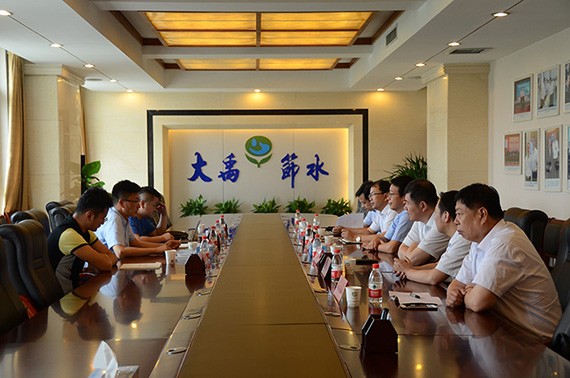 现场考察结束后,双方进行了座谈交流。大禹节水集团党委书记王冲对青海省水投公司领导一行莅临大禹节水集团考察表示热烈欢迎。王冲书记就公司基本情况及公司业务发展情况进行了介绍,重点介绍了公司在“三农三水”方面取得的成绩及PPP项目模式在全国的推广建设情况。王冲表示,大禹节水集团以农和水为中心,形成了以“农业高效节水、农民安全饮水、农村污水处理”的产业格局,实现了全产业链覆盖并取得了良好的社会效应。大禹节水集团愿与青海省水投公司强强联合,充分发挥双方资源优势,互利共赢,共同开发青海水务事业,为使农业更智慧、农村更美好、农民更幸福做出应有的贡献。