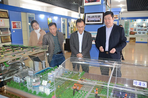 贾汝明一行首先来到大禹节水集团展厅,从大禹集团发展历程、科技创新、企业文化、荣誉资质、国际交流与考察等方面对大禹节水集团进行了全面了解,并现场参观了公司智能信息化控制灌溉系统模型运行过程,集团公司总裁谢永生、董事会秘书王光敏就公司基本情况进行了介绍汇报。