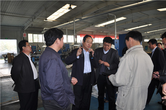 大禹节水集团股份有限公司董事长王栋在滴灌带车间向各位领导介绍滴灌带产品