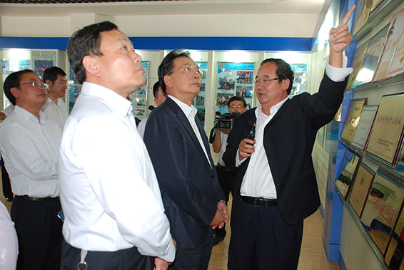 郑晖一行在大禹节水集团展厅调研,集团公司董事长王栋作情况介绍