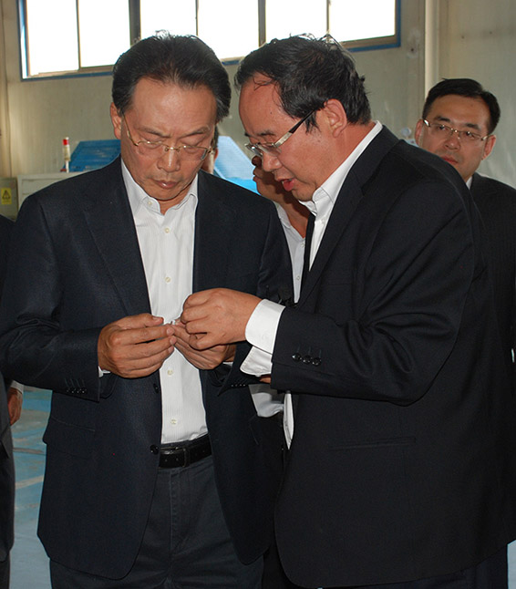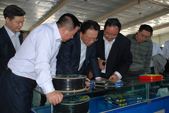 集团公司董事长王栋向中国农业发展银行党委书记、行长郑晖介绍公司滴灌管产品