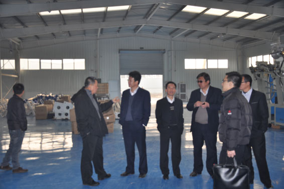 美国加利福尼亚州现代建筑材料公司总裁大卫.黄先生一行集团公司副董事长王冲、大禹节水(天津)有限公司总经理张学双的陪同下在天津公司PVC/PE车间参观考察