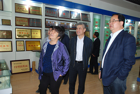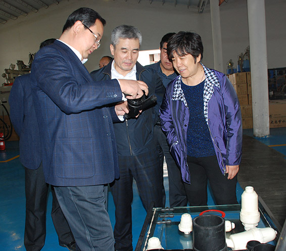 大禹节水集团公司董事长王栋陪同审查专家组一行在公司展厅考察