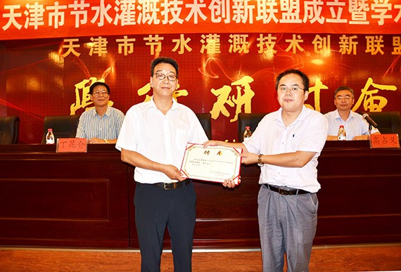 会议由大禹节水集团公司党委书记、大禹节水(天津)有限公司董事长王冲主持。天津市武清区人民政府副区长曲海富,天津市科学技术委员会农村科技处吴晓博士,天津市武清区科学技术委员会主任高巧生,天津市武清区工业经济委员会党委委员、副书记、主任马桂新,天津市武清区科学技术协会主席艾玉田,大王古庄镇党委书记张大国,京滨工业园开发有限公司总经理夏振峰,国际灌排委员会终身名誉主席、中国水利水电科学研究院总工程师高占义,国际灌排委员会副主席丁昆仑,中国水利水电科学研究院水利所副所长杨继富出席会议。大禹节水集团公司董事长王浩宇、副总裁薛瑞清、总工程师杨正武、大禹节水(天津)有限公司总经理张学双以及有关高等院校、科研所专家等灌溉行业专家代表共计50余人参加会议。会议审议了天津大学、天津农学院、大禹节水集团股份有限公司、大禹节水(天津)有限公司、沃达尔(天津)股份有限公司、北京新华节水产品认证有限公司等15家单位为天津市节水灌溉技术创新联盟第一批联盟成员单位。审议通过了联盟成立协议书和联盟章程,大禹节水(天津)有限公司为联盟首届理事长单位。选举大禹节水(天津)有限公司董事长王冲为联盟理事长,国际灌排委员会终身名誉主席、中国水利水电科学研究院总工程师高占义出任专家技术委员会主任,大禹节水(天津)有限公司总经理张学双出任秘书处秘书长,天津博微通达科技有限公司总经理出任秘书处副秘书长。联盟理事长王冲向联盟秘书处及专家委员会专家颁发了聘书。