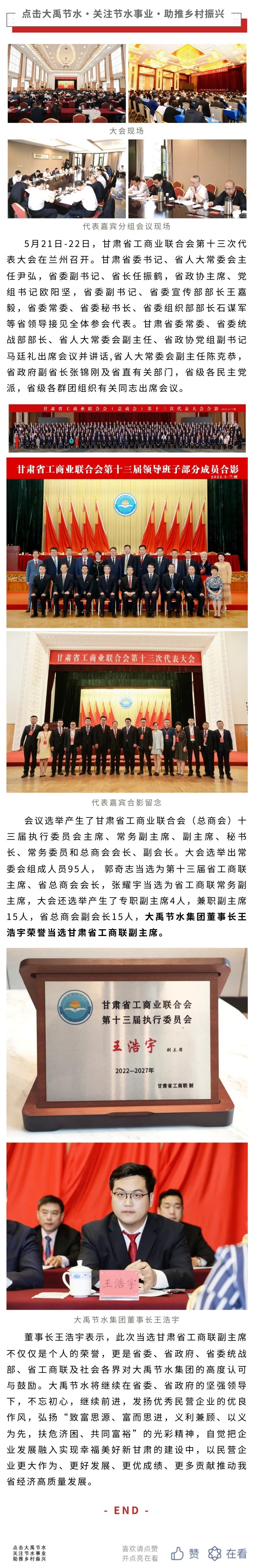 大禹荣誉| 大禹节水集团董事长王浩宇荣誉当选甘肃省工商联副主席