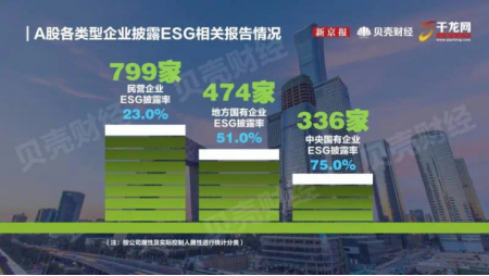 据贝壳财经统计,A股共有1758家公司披露2022年ESG报告(含社会责任报告等多种类型),其中民营企业有799家,占全部披露企业的45.45%,但民营企业披露ESG报告的比例仅为23%,而地方国有企业、中央国有企业的披露比率则分别为51%、75%。