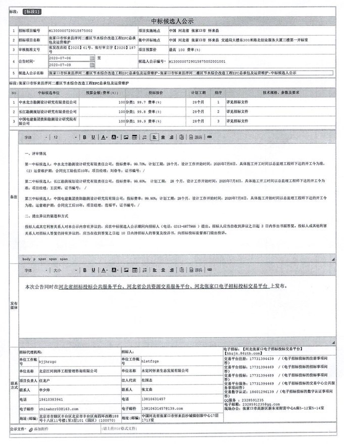 7月6日,大禹节水全资子公司甘肃水利水电工程公司参与张家口市怀来县洋河二灌区节水综合改造工程EPC总承包及运营维护项目,预中标金额31,445.48万元。