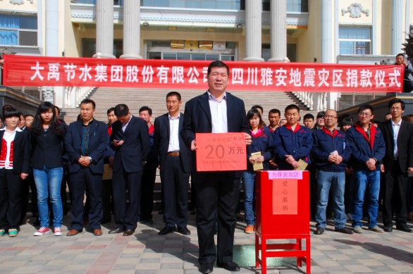 大禹节水集团党委书记、董事长王栋在第一时间作出向雅安灾区捐款20万元的重要指示,大禹节水集团总裁谢永生代表集团捐款